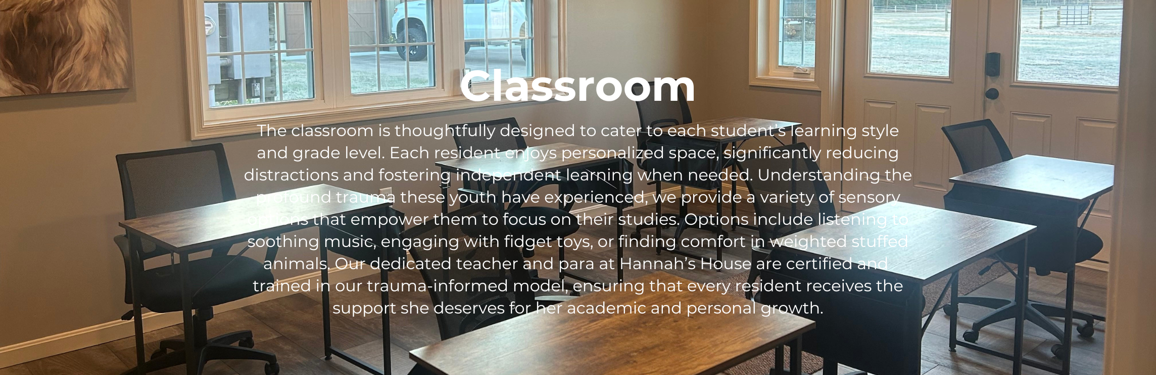 We’ve also taken care to ensure our staff members have private spaces to work and relax. Our staff rooms, offices, and staff retreat room are all designed to limit burnout and ensure they are equipped to be the best caregiver for the girls.
